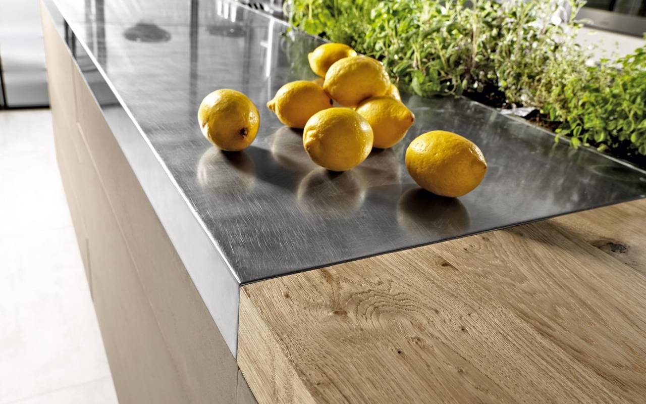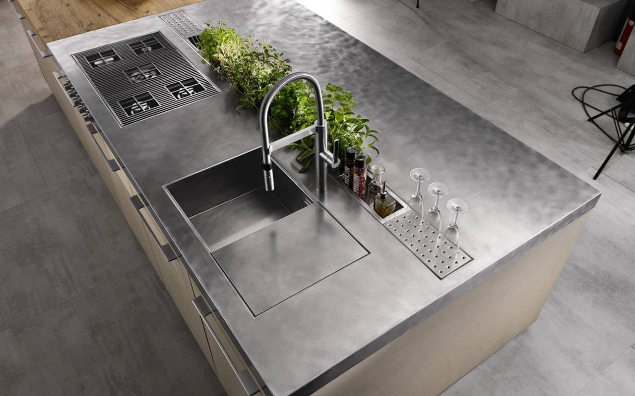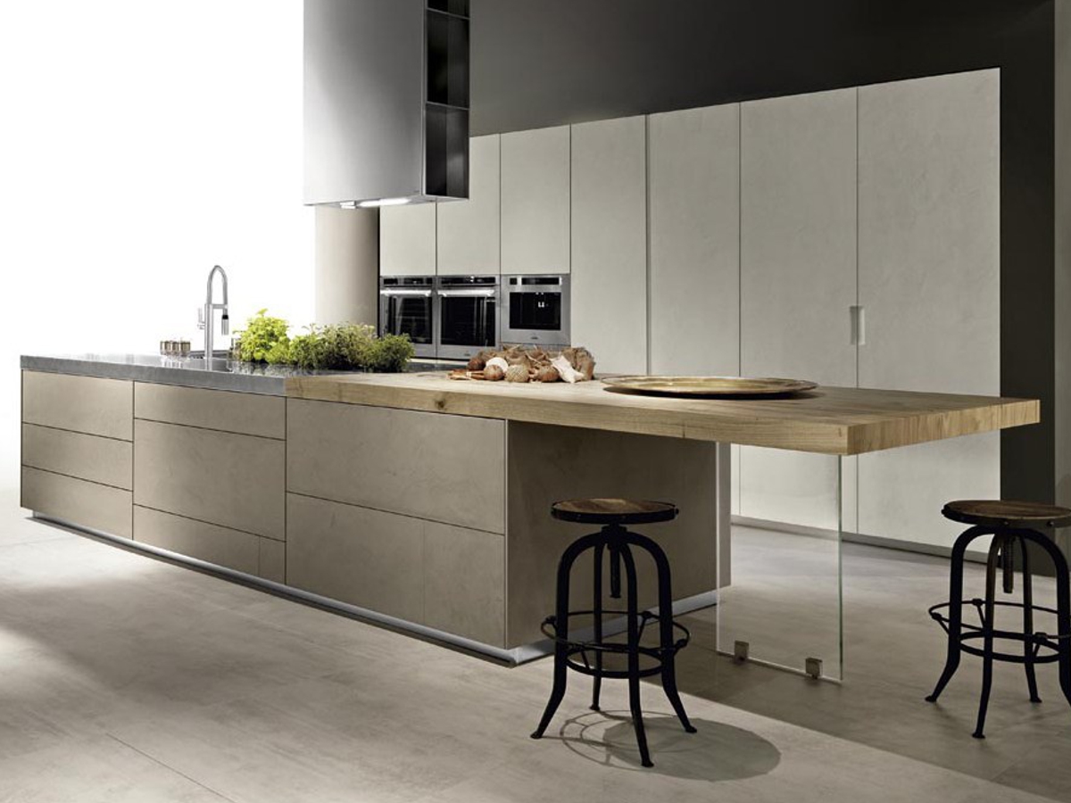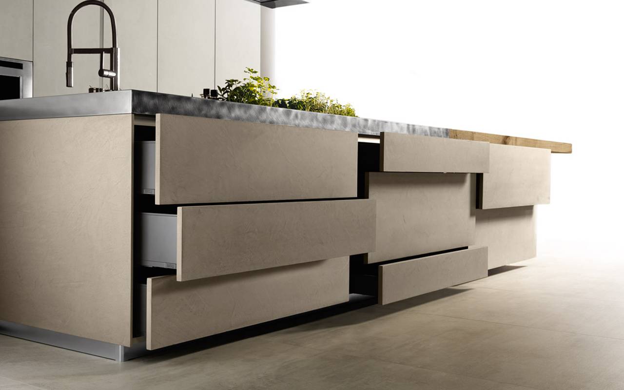 The columns are in cement light grey and the island is in cement tortora. The worktop is in vintage stainless steel (thickness 8 cm). The flexibility of the project is the added value of the composition. Overlapping lines and cement elements are the protagonists of the scene. A transversal project for maximum freedom of composition and customization; advanced ergonomics to improve interaction between man and objects, needs and functions. A project that improves the quality of life in the home, transforming it into a space where man is at the centre of the design process. The concept is in harmony with contemporary lifestyles, it transforms the kitchen into an increasingly personal space.